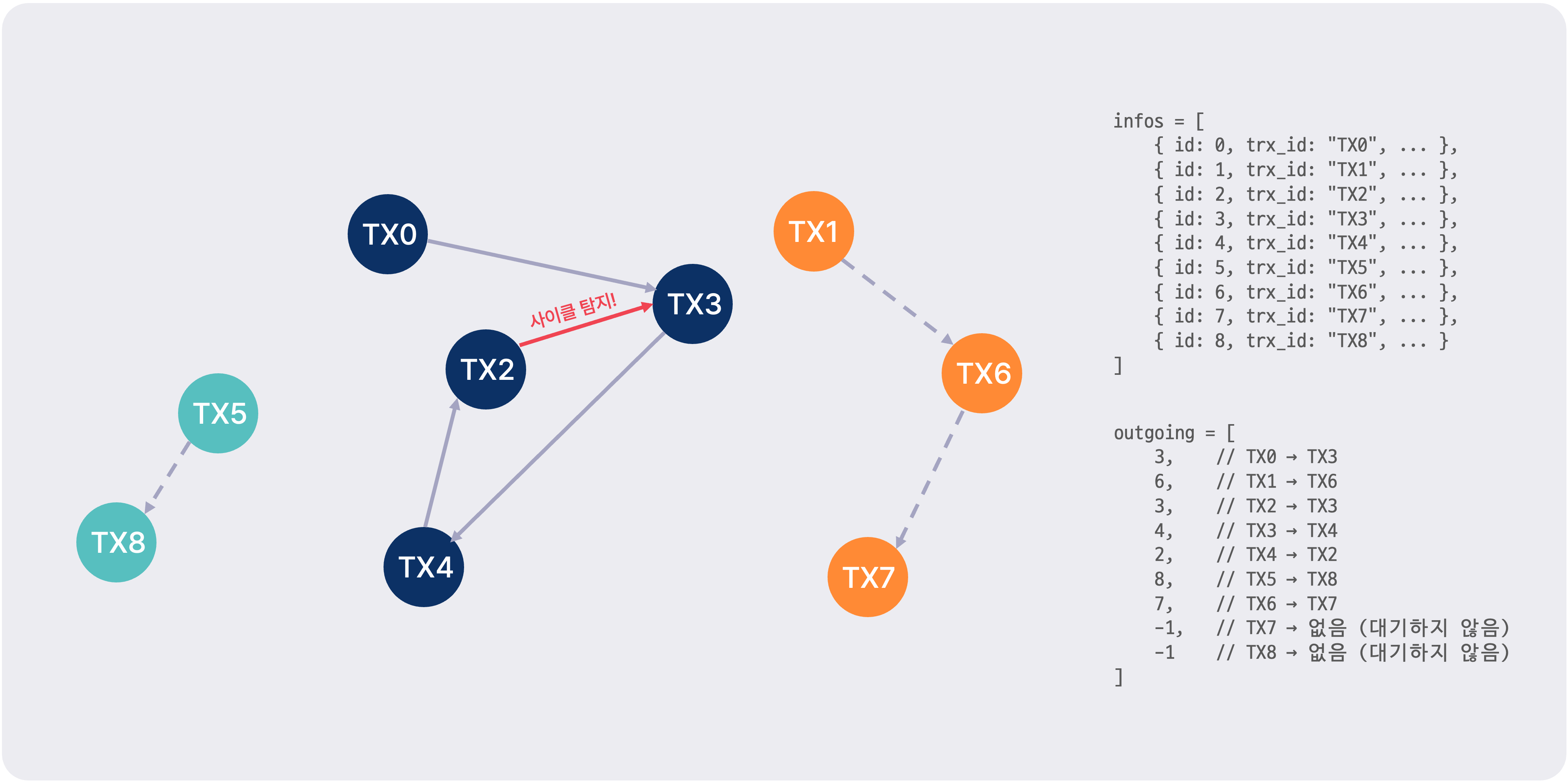 정렬 후에는 각 트랜잭션(from)에 대해 그것이 대기하는 트랜잭션(needle.trx = infos[from].waits_for)을 찾고, 찾으면 해당 인덱스를 outgoing[from]에 저장합니다. 이는 방향 그래프의 간선을 표현하는 방식입니다.