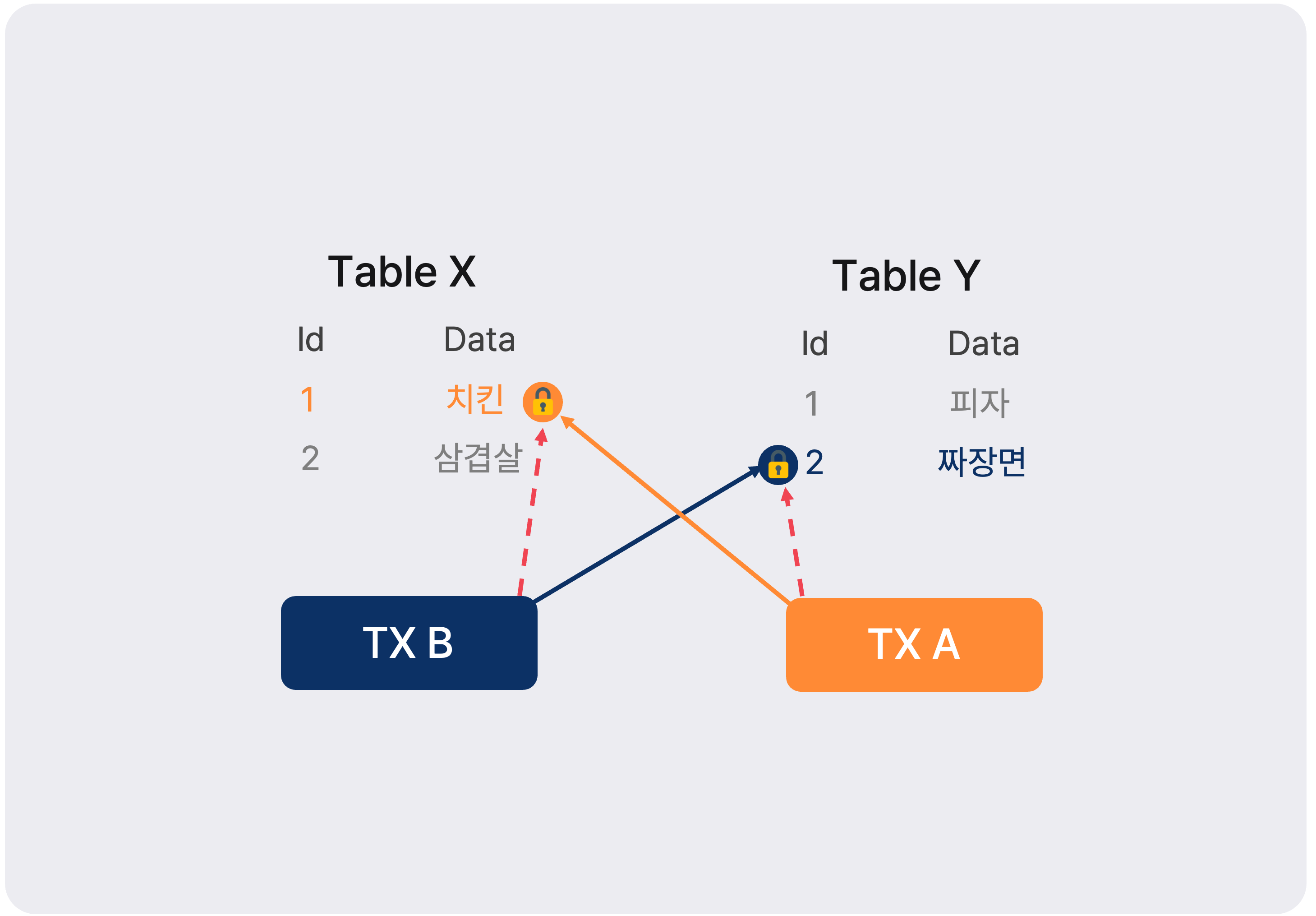 - 트랜잭션 A가 테이블 Y의 행 2에 접근하려고 시도 (B가 잠금 중이라 대기)